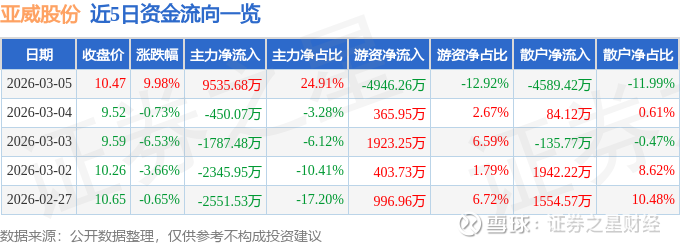 3月5日的资金流向数据方面,主力资金净流入9535.68万元,占总成交额24.91%,游资资金净流出4946.26万元,占总成交额12.92%,散户资金净流出4589.42万元,占总成交额11.99%。