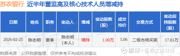 证券之星消息,根据3月5日市场公开信息、上市公司公告及交易所披露数据整理,苏农银行(603323)最新董监高及相关人员股份变动情况:2026年2月25日公司董事陈志明共增持公司股份1.0万股,占公司总股本为0.0005%。变动期间公司股价上涨0.0%,2月25日当日收盘报5.05元。