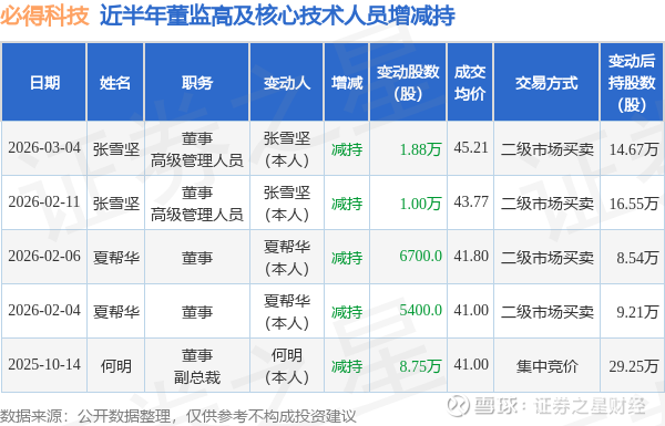 证券之星消息,根据3月5日市场公开信息、上市公司公告及交易所披露数据整理,必得科技(605298)最新董监高及相关人员股份变动情况:2026年3月4日公司董事,高级管理人员张雪坚共减持公司股份1.88万股,占公司总股本为0.01%。变动期间公司股价上涨1.66%,3月4日当日收盘报45.28元。
