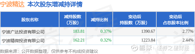 证券之星消息,3月5日宁波精达发布公告《宁波精达:宁波精达关于股东及董事减持股份结果公告》,其股东宁波广达投资有限公司、宁波精微投资有限公司于2026年2月27日至2026年3月5日间合计减持346.02万股,占公司目前总股本的0.6888%,变动期间该股股价下跌7.12%,截止3月5日收盘报12.66元。