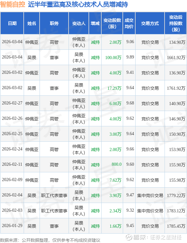 智能自控近半年内的董监高及核心技术人员增减持详情如下: