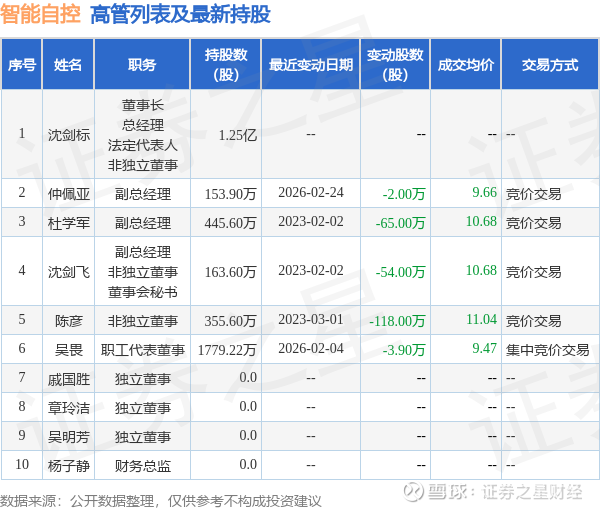智能自控的高管列表及最新持股情况如下: