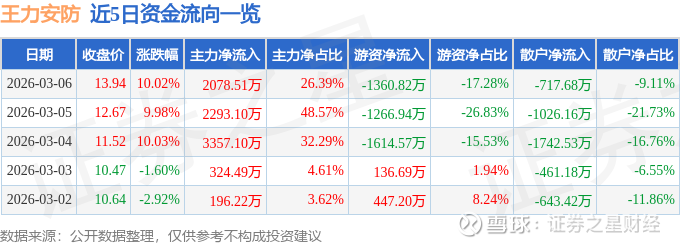证券之星消息,王力安防3月6日涨停收盘,收盘价13.94元。该股于9点25分涨停,未打开涨停,截止收盘封单资金为5.66亿元,占其流通市值9.22%。