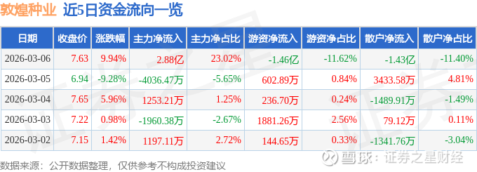 证券之星消息,敦煌种业3月6日涨停收盘,收盘价7.63元。该股于9点49分涨停,7次打开涨停,截止收盘封单资金为1947.02万元,占其流通市值0.48%。