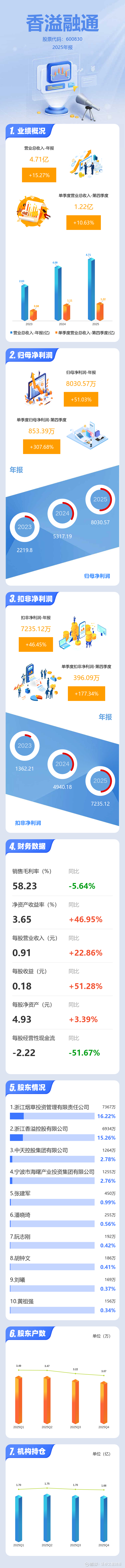 证券之星消息,香溢融通2025年年报显示,当年度公司主营收入4.71亿元,同比上升15.28%;归母净利润8030.57万元,同比上升51.03%;扣非净利润7235.12万元,同比上升46.45%;其中2025年第四季度,公司单季度主营收入1.22亿元,同比上升10.63%;单季度归母净利润853.39万元,同比上升307.69%;单季度扣非净利润396.09万元,同比上升177.35%;负债率52.17%,投资收益36.55万元,财务费用-468.75万元,毛利率58.23%。
