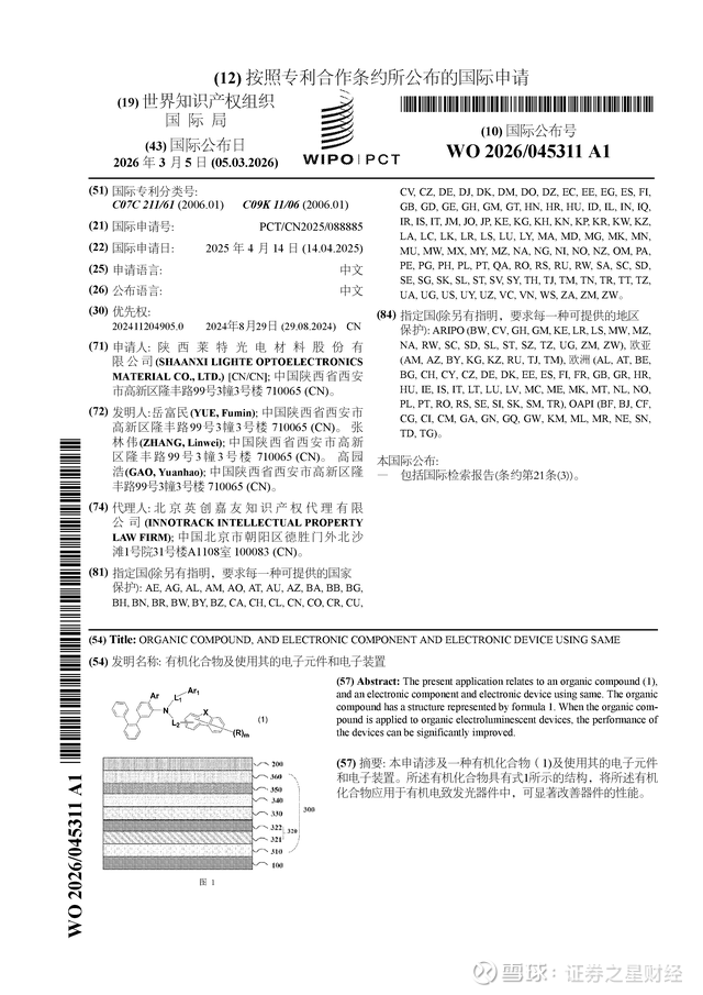 证券之星消息,根据企查查数据显示莱特光电(688150)公布了一项国际专利申请,专利名为“有机化合物及使用其的电子元件和电子装置”,专利申请号为PCT/CN2025/088885,国际公布日为2026年3月5日。
