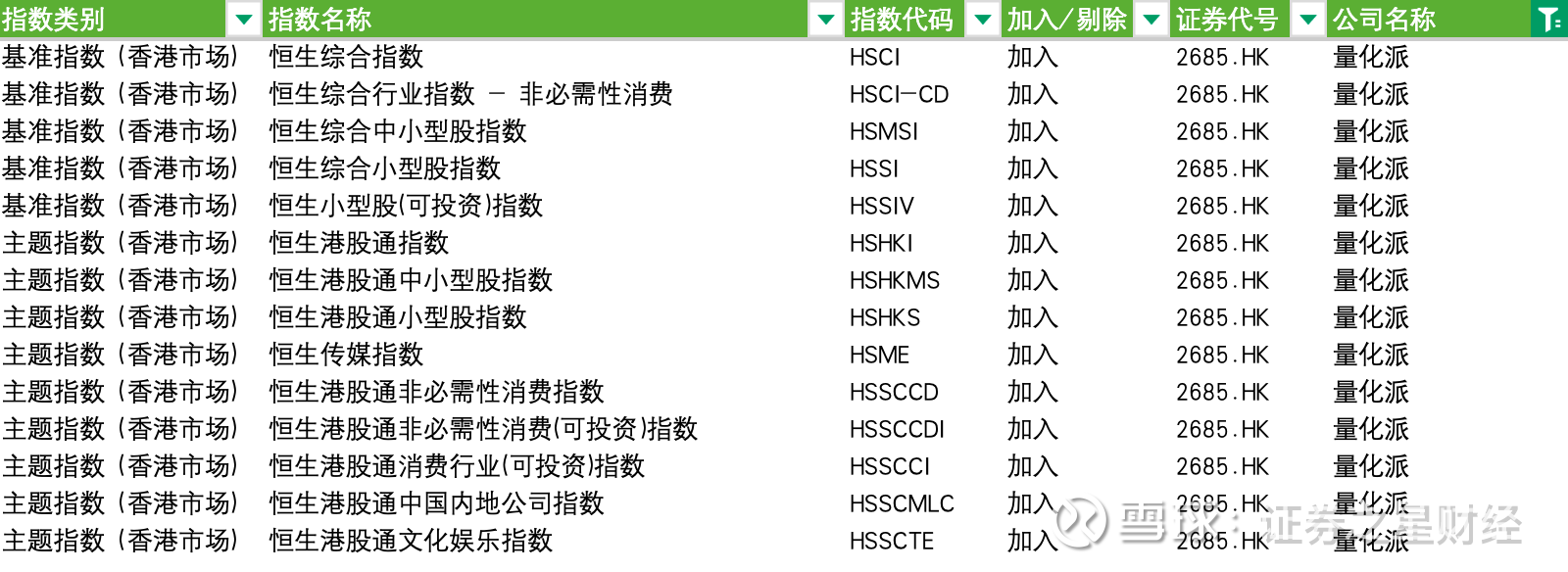 根据2月13日恒生指数公司宣布的季检结果,量化派已被纳入恒生综合指数、恒生综合行业指数-非必需性消费、恒生综合中小型股指数、恒生综合小型股指数、恒生小型股(可投资)指数、恒生港股通指数、恒生港股通中小型股指数、恒生港股通小型股指数、恒生传媒指数、恒生港股通非必需性消费指数、恒生港股通非必需性消费(可投资)指数、恒生港股通消费行业(可投资)指数、恒生港股通中国内地公司指数、恒生港股通文化娱乐指数在内的14只指数。这一系列恒生指数的成分股及港股通标的变动于3月9日同步生效。