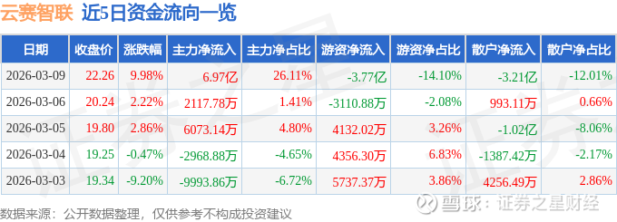 3月9日的资金流向数据方面,主力资金净流入6.97亿元,占总成交额26.11%,游资资金净流出3.77亿元,占总成交额14.1%,散户资金净流出3.21亿元,占总成交额12.01%。