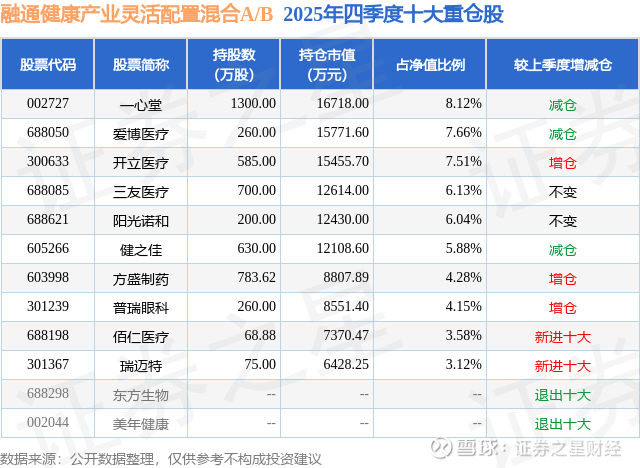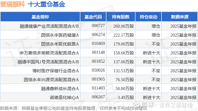 根据2025基金年报公募基金重仓股数据,重仓该股的公募基金共9家,其中持有数量最多的公募基金为融通基金的融通健康产业灵活配置混合A/B。融通健康产业灵活配置混合A/B目前规模为14.79亿元,最新净值2.716(3月6日),较上一交易日上涨1.72%,近一年上涨11.72%。该公募基金现任基金经理为万民远。万民远在任的基金产品包括:融通鑫新成长混合A,管理时间为2021年10月8日至今,期间收益率为30.8%;融通价值成长混合A,管理时间为2022年7月18日至今,期间收益率为29.26%;融通医疗保健行业混合A/B,管理时间为2023年3月15日至今,期间收益率为-21.78%。