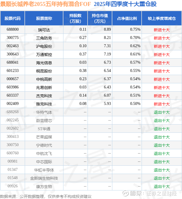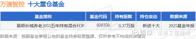 根据2025基金年报公募基金重仓股数据,重仓该股的公募基金共1家,其中持有数量最多的公募基金为景顺长城基金的景顺长城养老2055五年持有混合FOF。景顺长城养老2055五年持有混合FOF目前规模为0.12亿元,最新净值1.2031(3月4日),较上一交易日下跌1.1%。该公募基金现任基金经理为江虹。江虹在任的基金产品包括:景顺长城保守养老一年持有混合(FOF)A,管理时间为2024年3月20日至今,期间收益率为9.1%;景顺长城臻品三个月持有期混合(FOF)A,管理时间为2024年12月26日至今,期间收益率为21.09%;景顺长城安恒增益三个月持有混合(FOF)A,管理时间为2025年8月27日至今,期间收益率为1.86%。