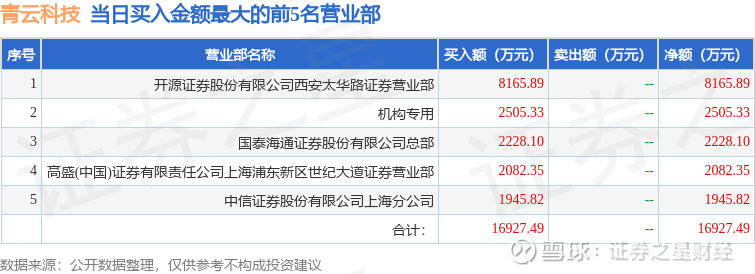证券之星消息,沪深交易所2026年3月9日公布的交易公开信息显示,青云科技(688316)因有价格涨跌幅限制的日收盘价格涨幅达到15%的前五只证券登上龙虎榜。此次是近5个交易日内第1次上榜。