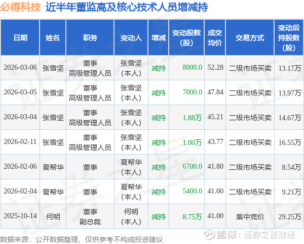 证券之星消息,根据3月9日市场公开信息、上市公司公告及交易所披露数据整理,必得科技(605298)最新董监高及相关人员股份变动情况:2026年3月6日公司董事,高级管理人员张雪坚共减持公司股份8000.0股,占公司总股本为0.0043%。变动期间公司股价上涨2.65%,3月6日当日收盘报51.13元。