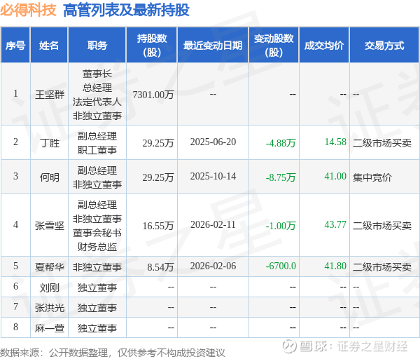 必得科技的高管列表及最新持股情况如下:
