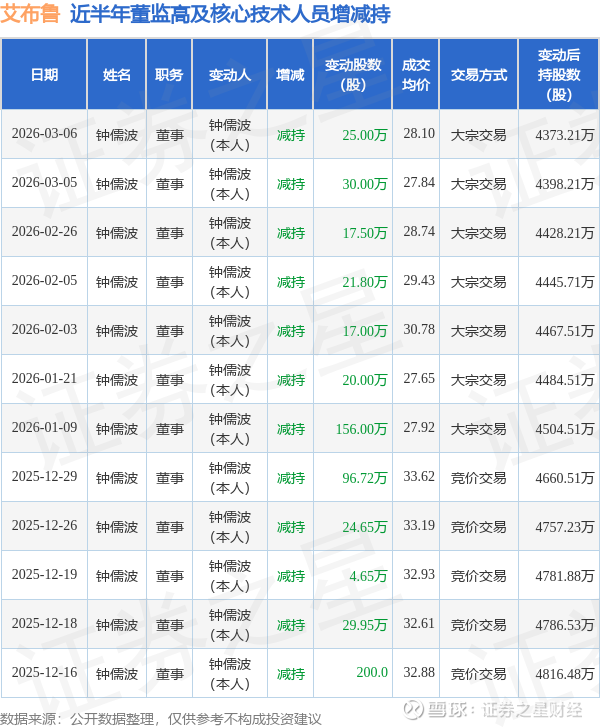 艾布鲁近半年内的董监高及核心技术人员增减持详情如下: