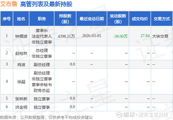 证券之星消息,根据3月9日市场公开信息、上市公司公告及交易所披露数据整理,艾布鲁(301259)最新董监高及相关人员股份变动情况:2026年3月6日公司董事钟儒波共减持公司股份25.0万股,占公司总股本为0.1603%。变动期间公司股价上涨4.64%,3月6日当日收盘报36.75元。