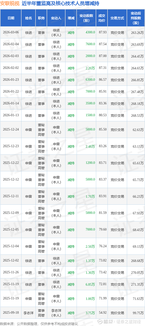 安联锐视近半年内的董监高及核心技术人员增减持详情如下: