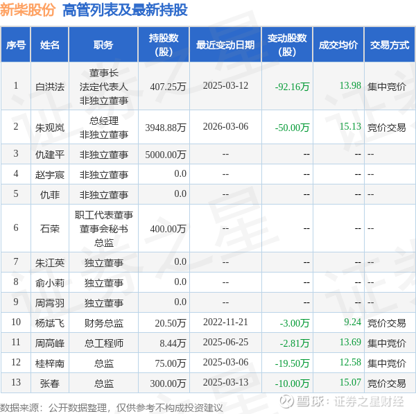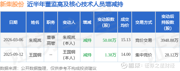 新柴股份近半年内的董监高及核心技术人员增减持详情如下: