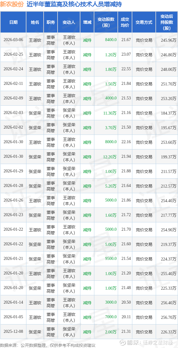 新农股份近半年内的董监高及核心技术人员增减持详情如下: