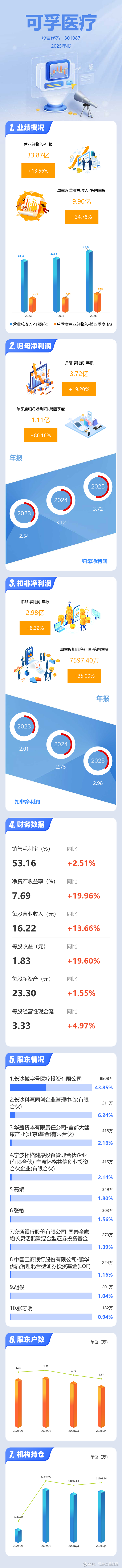 证券之星消息,可孚医疗2025年年报显示,当年度公司主营收入33.87亿元,同比上升13.56%;归母净利润3.72亿元,同比上升19.2%;扣非净利润2.98亿元,同比上升8.33%;其中2025年第四季度,公司单季度主营收入9.9亿元,同比上升34.79%;单季度归母净利润1.11亿元,同比上升86.17%;单季度扣非净利润7597.4万元,同比上升35.01%;负债率26.04%,投资收益1584.46万元,财务费用-298.75万元,毛利率53.16%。