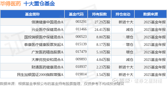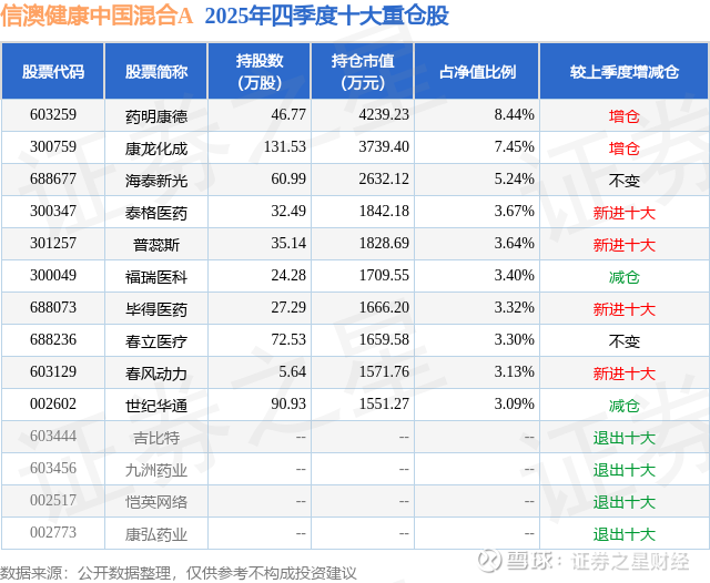 根据2025基金年报公募基金重仓股数据,重仓该股的公募基金共8家,其中持有数量最多的公募基金为信达澳亚基金的信澳健康中国混合A。信澳健康中国混合A目前规模为4.09亿元,最新净值2.184(3月9日),较上一交易日下跌1.75%,近一年上涨16.52%。该公募基金现任基金经理为李君周。