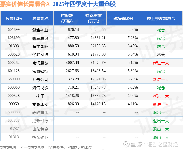嘉实价值长青混合A的前十大重仓股如下: