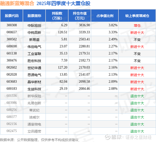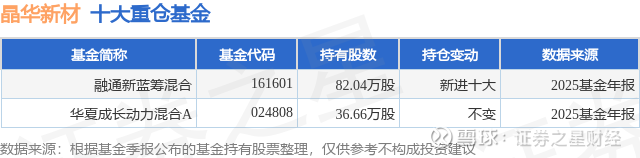 根据2025基金年报公募基金重仓股数据,重仓该股的公募基金共2家,其中持有数量最多的公募基金为融通基金的融通新蓝筹混合。融通新蓝筹混合目前规模为10.04亿元,最新净值1.053(3月9日),较上一交易日下跌1.38%,近一年上涨27.7%。该公募基金现任基金经理为何龙。何龙在任的基金产品包括:融通领先成长混合(LOF)A,管理时间为2018年8月23日至今,期间收益率为105.96%;融通红利机会主题精选混合A,管理时间为2019年8月22日至今,期间收益率为148.04%;融通稳信增益6个月持有期混合A,管理时间为2022年1月25日至今,期间收益率为46.79%。