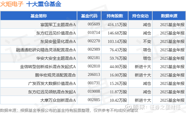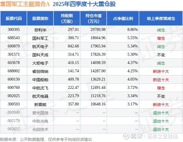根据2025基金年报公募基金重仓股数据,重仓该股的公募基金共13家,其中持有数量最多的公募基金为富国基金的富国军工主题混合A。富国军工主题混合A目前规模为29.18亿元,最新净值1.997(3月9日),较上一交易日下跌1.72%,近一年上涨43.21%。该公募基金现任基金经理为孟浩之。孟浩之在任的基金产品包括:富国创新发展两年定开混合A,管理时间为2022年1月26日至今,期间收益率为42.56%;富国产业驱动混合A,管理时间为2023年2月9日至今,期间收益率为13.23%;富国积极成长一年定开混合,管理时间为2025年9月5日至今,期间收益率为1.64%。