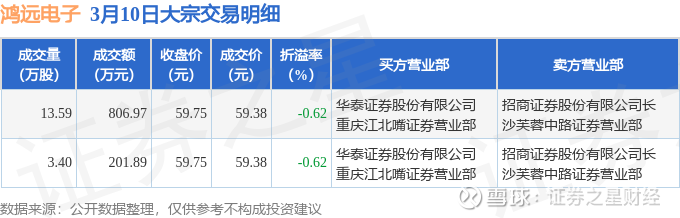 证券之星消息,3月10日鸿远电子发生大宗交易,交易数据如下: