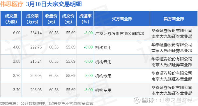 证券之星消息,3月10日伟思医疗发生大宗交易,交易数据如下:
