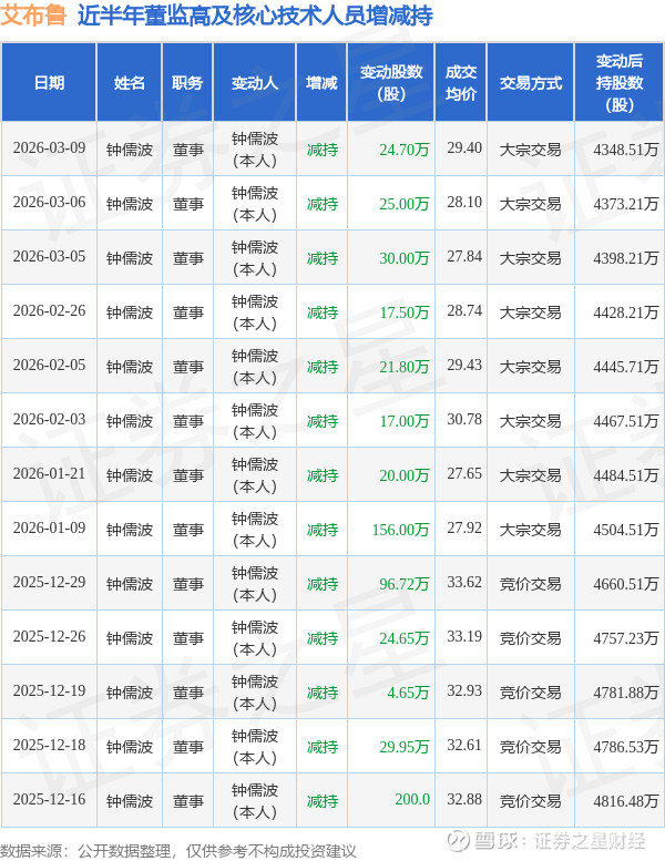 艾布鲁近半年内的董监高及核心技术人员增减持详情如下: