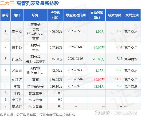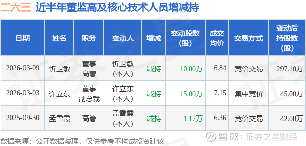 证券之星消息,根据3月10日市场公开信息、上市公司公告及交易所披露数据整理,二六三(002467)最新董监高及相关人员股份变动情况:2026年3月9日公司董事,高管忻卫敏共减持公司股份10.0万股,占公司总股本为0.0073%。变动期间公司股价上涨3.14%,3月9日当日收盘报6.9元。