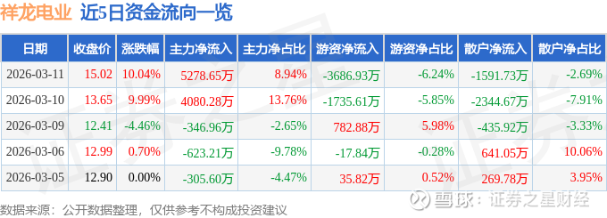 证券之星消息,祥龙电业3月11日涨停收盘,收盘价15.02元。该股于11点8分涨停,未打开涨停,截止收盘封单资金为3352.32万元,占其流通市值0.6%。