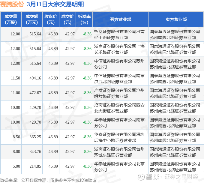 证券之星消息,3月11日赛腾股份发生大宗交易,交易数据如下: