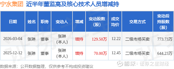 证券之星消息,根据3月11日市场公开信息、上市公司公告及交易所披露数据整理,宁水集团(603700)最新董监高及相关人员股份变动情况:2026年3月4日公司董事张琳共增持公司股份129.5万股,占公司总股本为0.6476%。变动期间公司股价下跌0.07%,3月4日当日收盘报13.56元。
