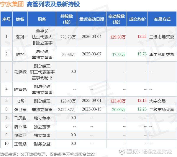宁水集团近半年内的董监高及核心技术人员增减持详情如下: