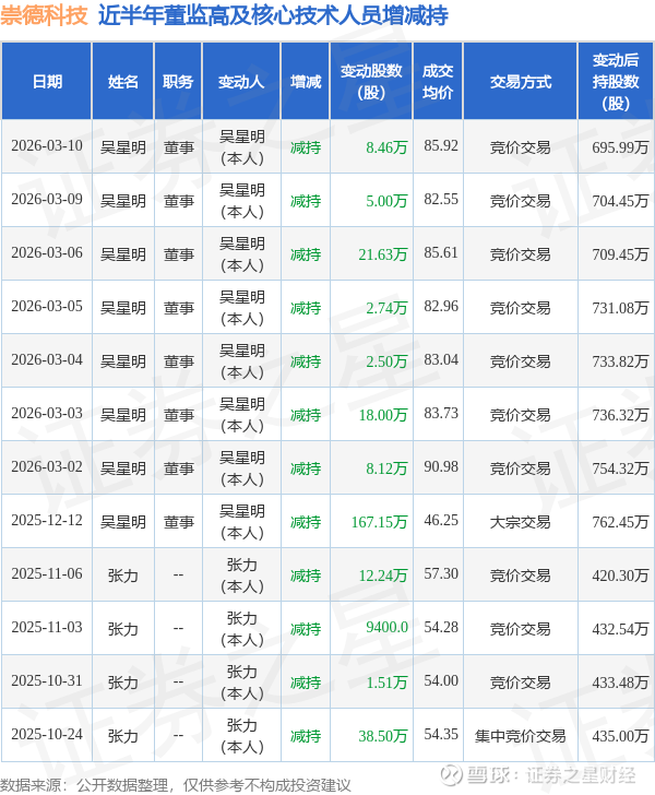 崇德科技近半年内的董监高及核心技术人员增减持详情如下: