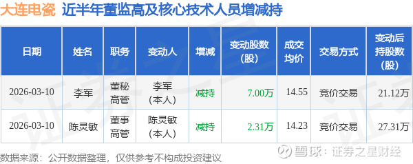 证券之星消息,根据3月11日市场公开信息、上市公司公告及交易所披露数据整理,大连电瓷(002606)最新董监高及相关人员股份变动情况:2026年3月10日公司董秘,高管李军、董事,高管陈灵敏共减持公司股份9.31万股,占公司总股本为0.0212%。变动期间公司股价上涨0.78%,3月10日当日收盘报14.19元。