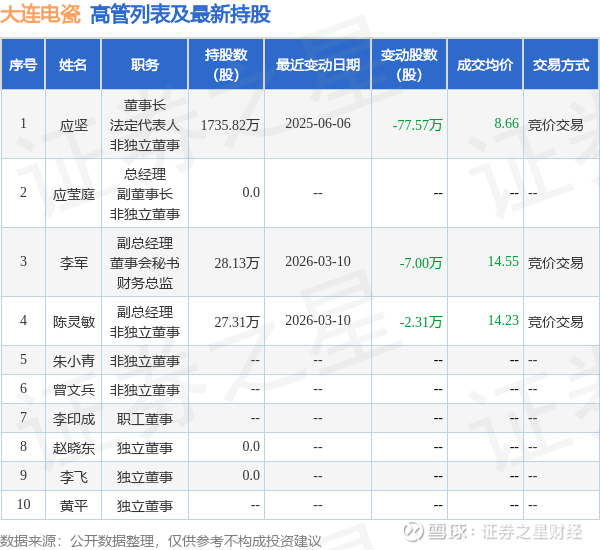 大连电瓷的高管列表及最新持股情况如下: