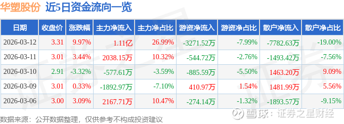 3月12日的资金流向数据方面,主力资金净流入1.11亿元,占总成交额26.99%,游资资金净流出3271.52万元,占总成交额7.99%,散户资金净流出7782.63万元,占总成交额19.0%。
