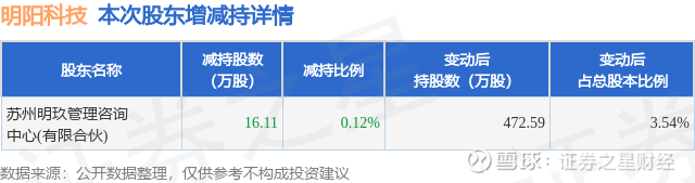 证券之星消息,3月12日明阳科技发布公告《明阳科技:股东减持股份结果公告》,其股东苏州明玖管理咨询中心(有限合伙)于2026年3月7日至2026年3月10日间合计减持16.11万股,占公司目前总股本的0.1206%,变动期间该股股价下跌1.78%,截止3月10日收盘报15.47元。
