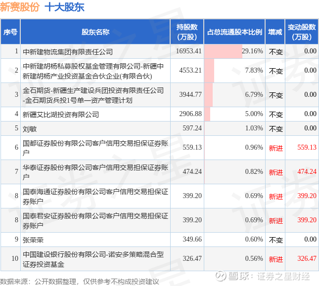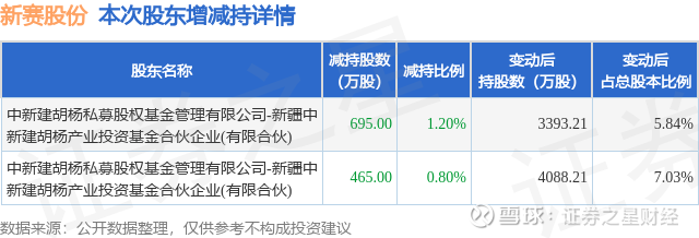 证券之星消息,3月12日新赛股份发布公告《新赛股份:新疆赛里木现代农业股份有限公司关于持股5%以上股东权益变动触及1%刻度的提示性公告》,其股东中新建胡杨私募股权基金管理有限公司-新疆中新建胡杨产业投资基金合伙企业(有限合伙)于2026年3月2日至2026年3月11日间合计减持1160.0万股,占公司目前总股本的1.9952%,变动期间该股股价上涨2.42%,截止3月11日收盘报5.51元。