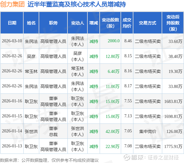 证券之星消息,根据3月12日市场公开信息、上市公司公告及交易所披露数据整理,创力集团(603012)最新董监高及相关人员股份变动情况:2026年3月10日公司高级管理人员朱民法共减持公司股份2000.0股,占公司总股本为0.0003%。变动期间公司股价上涨3.39%,3月10日当日收盘报8.53元。