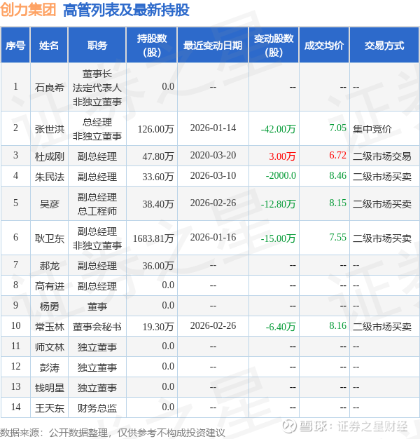 创力集团的高管列表及最新持股情况如下: