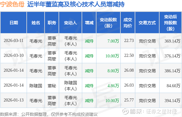 宁波色母近半年内的董监高及核心技术人员增减持详情如下: