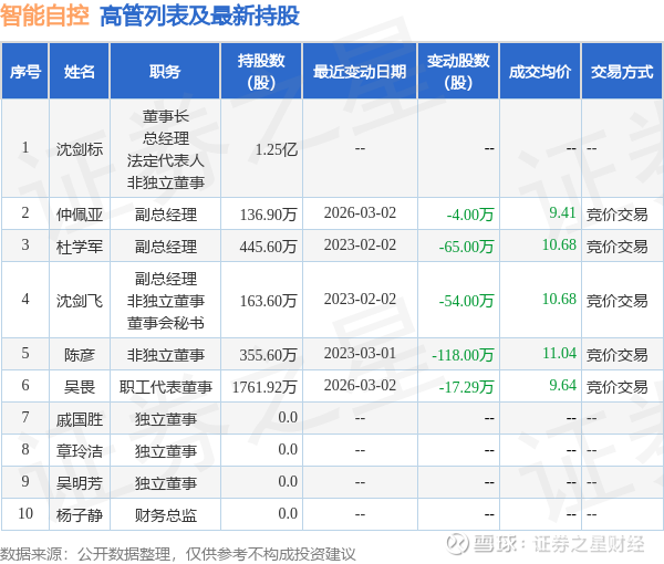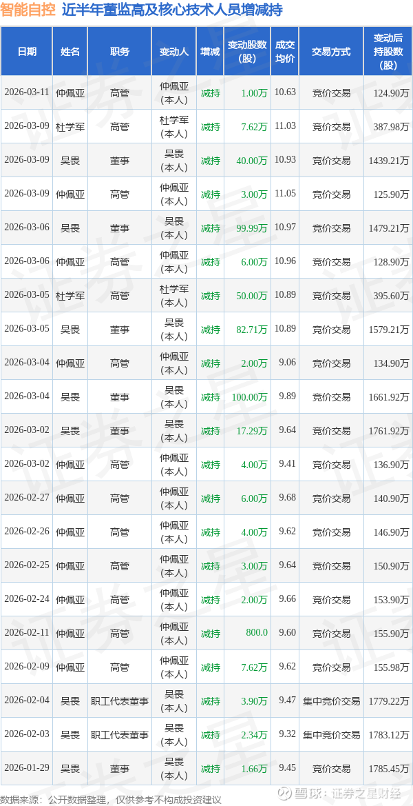 智能自控近半年内的董监高及核心技术人员增减持详情如下: