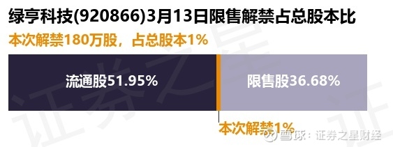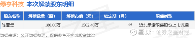 证券之星消息,根据市场公开信息整理,绿亨科技(920866)于3月13日将有180.0万股限售股份解禁,为公司追加承诺限售股份上市流通,占公司总股本1.0%。(本次数据根据历史公告整理得出,实际情况以上市公司最新公告为准)本次解禁后,公司还有6609.36万股限售股份,占总股本36.68%。具体如下图所示: