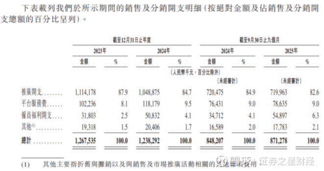 导致净利润率个位数的核心原因,在于公司沉重的营销负担。招股书显示,2023年、2024年以及2025年前三季度(以下简称“报告期内”),公司的销售及分销开支分别高达12.68亿元、12.38亿元和8.71亿元,占同期收入的比重分别达到65.1%、59.4%和57.6%。