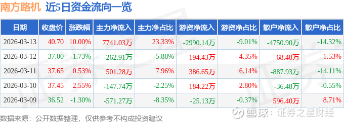 证券之星消息,南方路机3月13日涨停收盘,收盘价40.7元。该股于11点8分涨停,未打开涨停,截止收盘封单资金为3.36亿元,占其流通市值29.58%。
