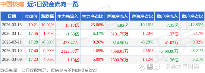 证券之星消息,中国核建3月13日涨停收盘,收盘价19.21元。该股于13点20分涨停,3次打开涨停,截止收盘封单资金为1.06亿元,占其流通市值0.18%。