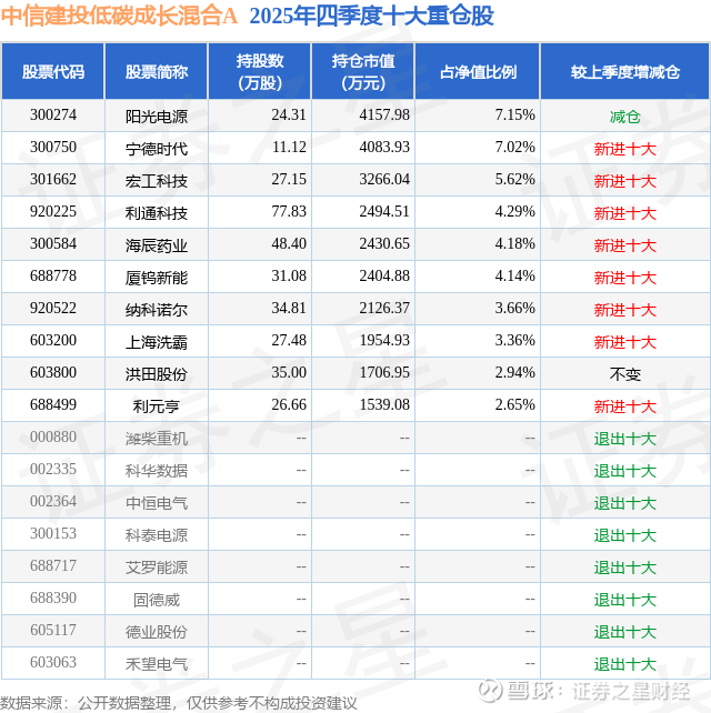 根据2025基金年报公募基金重仓股数据,重仓该股的公募基金共4家,其中持有数量最多的公募基金为中信建投基金的中信建投低碳成长混合A。中信建投低碳成长混合A目前规模为1.86亿元,最新净值0.5774(3月12日),较上一交易日下跌1.08%,近一年上涨18.73%。该公募基金现任基金经理为周紫光。周紫光在任的基金产品包括:中信建投智信物联网A,管理时间为2017年5月27日至今,期间收益率为43.59%;中信建投智享生活混合A,管理时间为2020年11月4日至今,期间收益率为-36.79%;